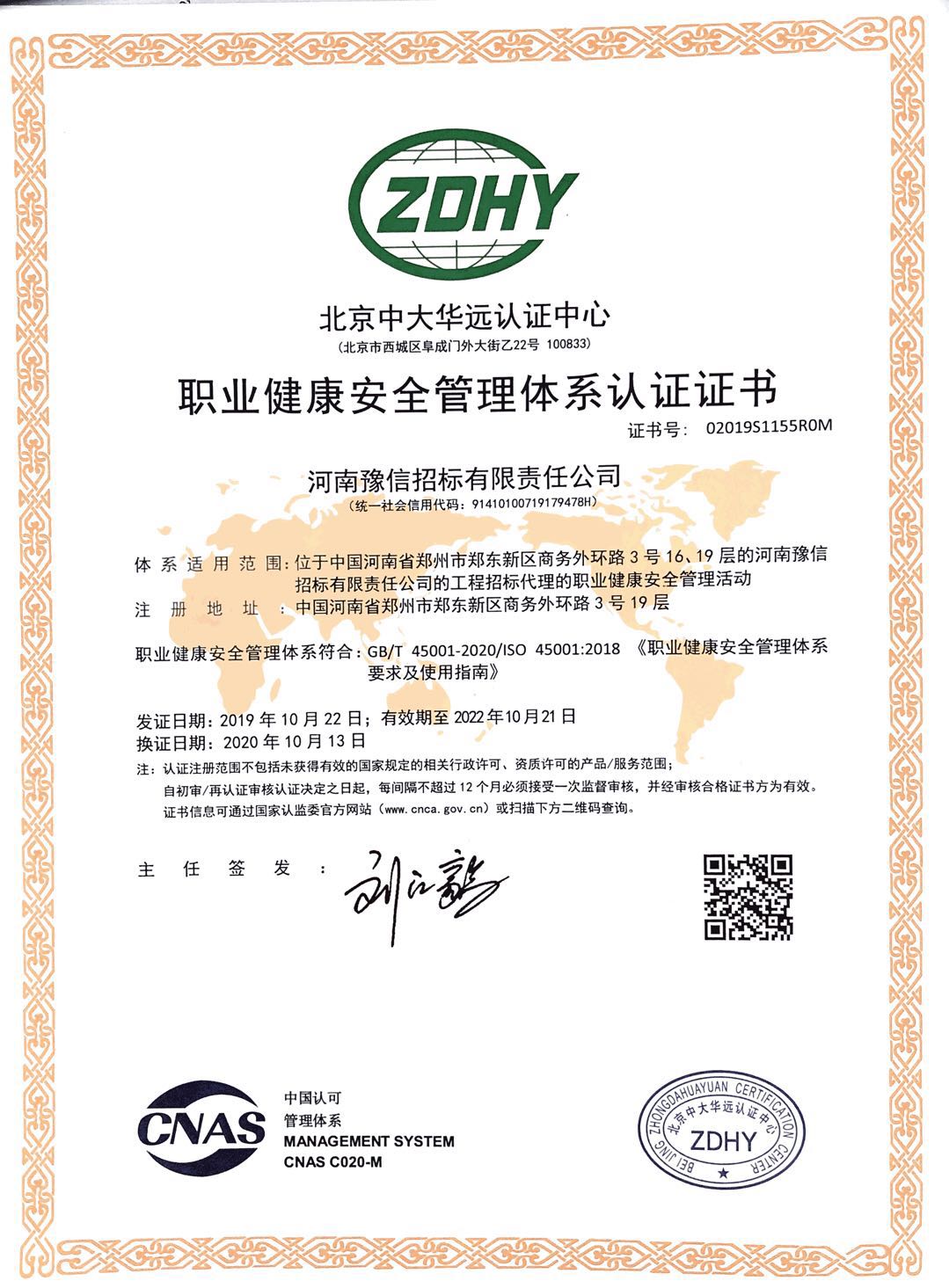 河南豫信招標(biāo)有限責(zé)任公司OHSMSSMS中文證書 -