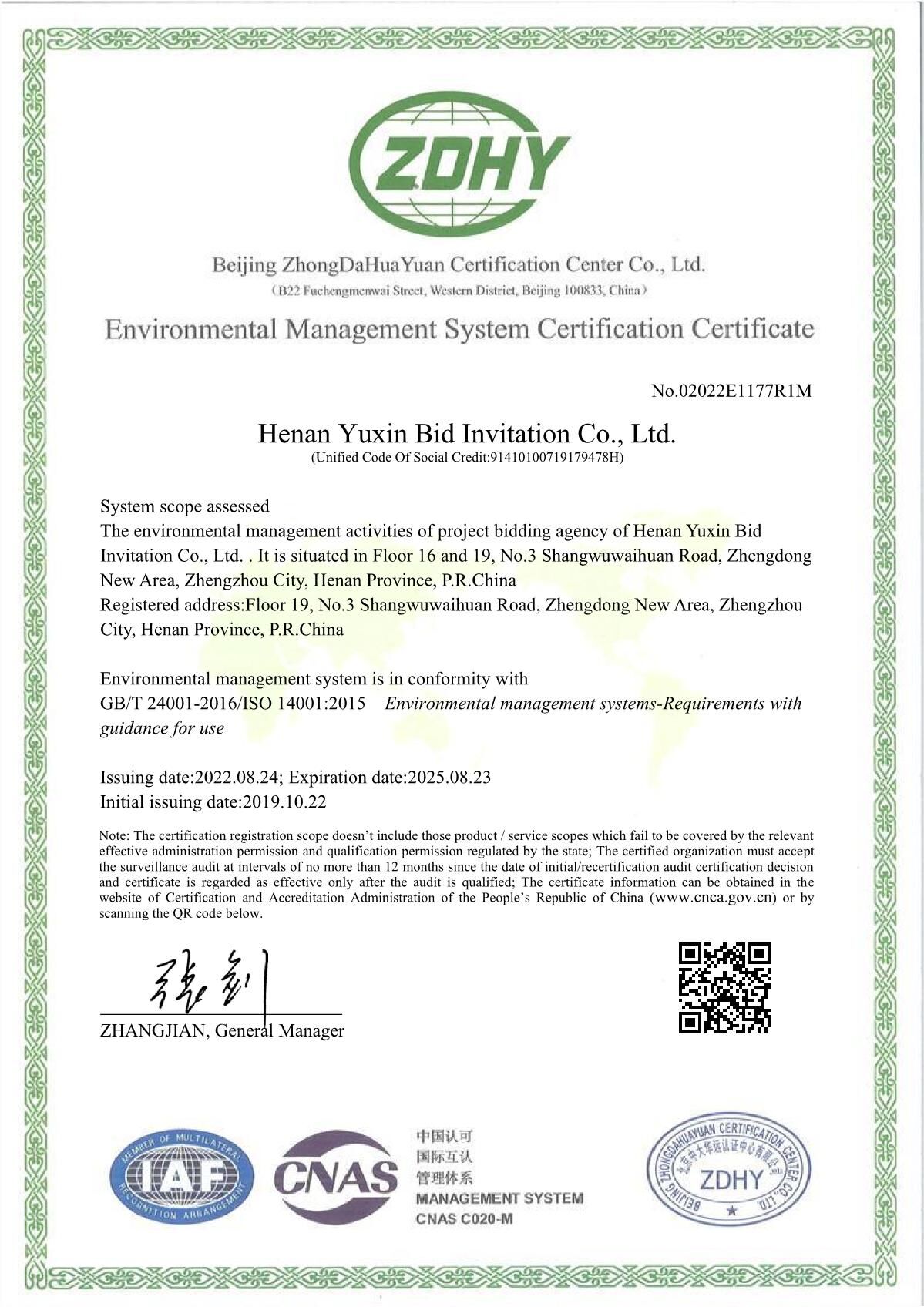 環(huán)境管理體系認(rèn)證證書 -